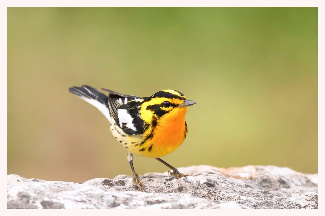 The Blackburnian Warbler, a tiny, strong flier, usually spends its time in forest canopy.